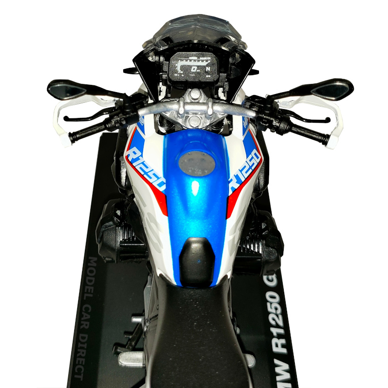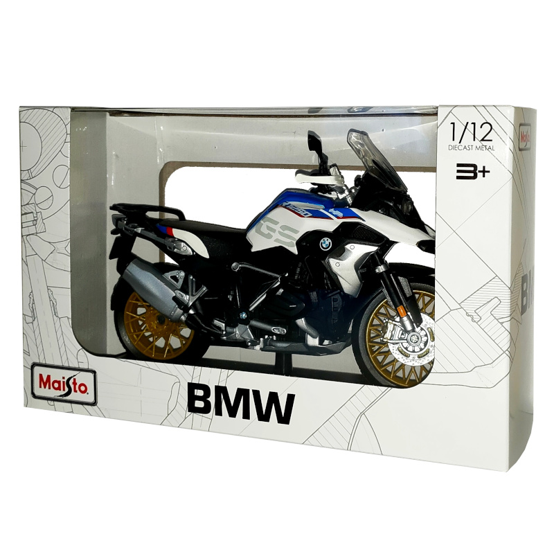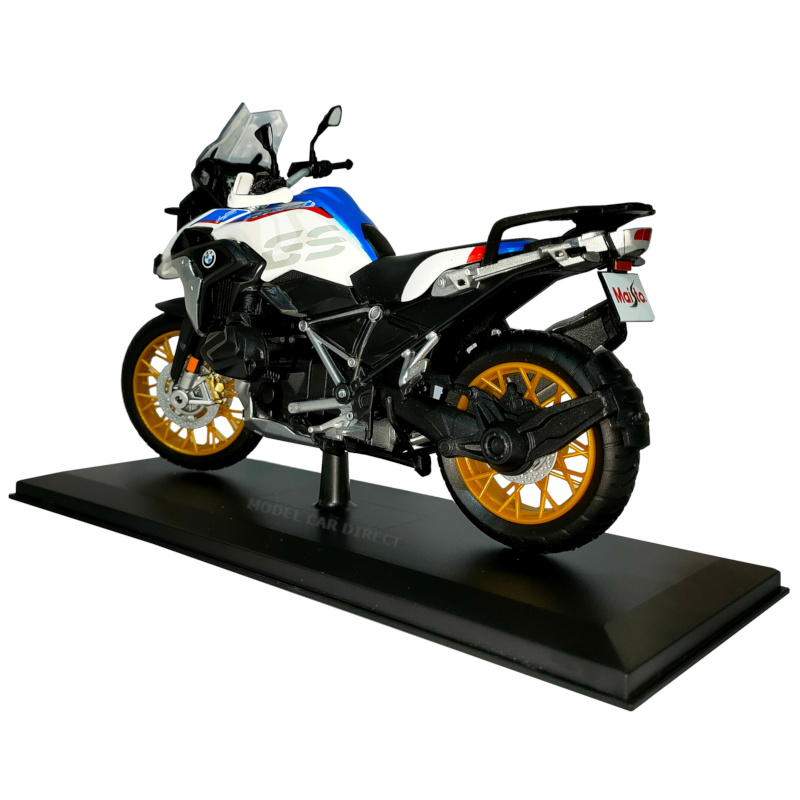 The BMW R1250 GS in White with blue/red/silver detailing from the Maisto 1/12 die-cast motorcycle is a highly detailed model bike. It features high level of details including working kick stand and steering.